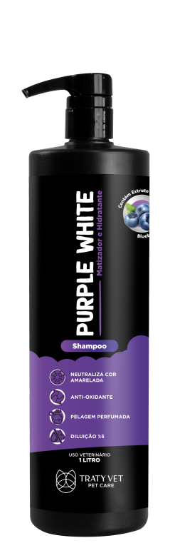 A linha Purple-White, foi desenvolvida especialmente para Neutralizar a tonalidade amarelada que aparece nos fios brancos. Seu principal componente ativo é o Pigmento Violeta, que se deposita nos fios e devolve a tonalidade branca. Enriquecida também com o Óleo de Argan e Extrato de Blueberry, ativos ricos em nutrientes, com absorção quase que instantânea, o que torna o processo do banho mais rápido e agradável ao animal. Para um melhor resultado use a linha completa.